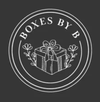White line drawing of a gift box with a bow and foliage, surrounded by text 'Boxes by B' in a circular design, all on a black background.